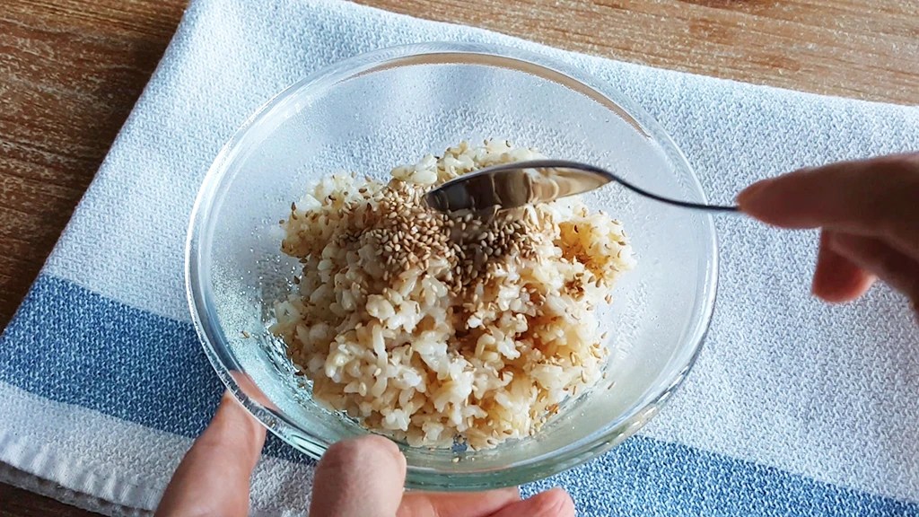 If the rice is hot, cool it down to room temperature. Season the rice lightly with salt, sesame oil, and sesame seeds. Gently and quickly mix until the grains are evenly coated and seasoned.