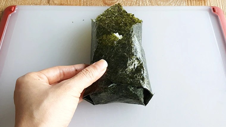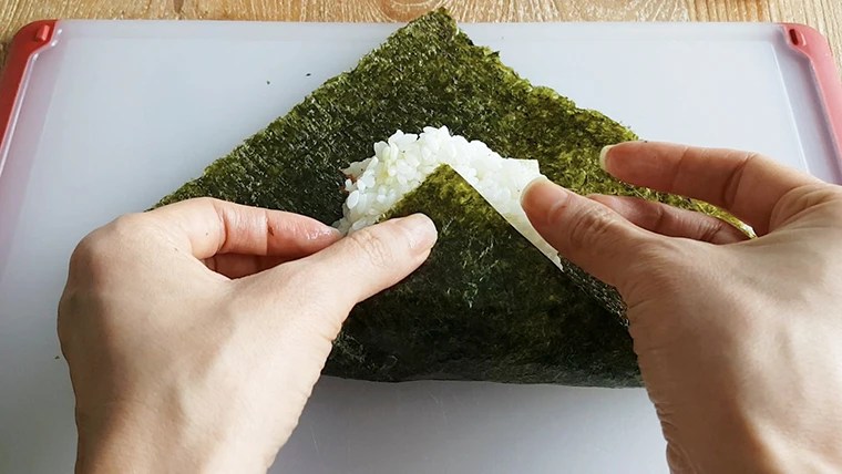 - Fold the bottom up and the two sides toward the center, tightly tucking in the corners. Then fold the top over and seal with a few grains of rice. To serve, turn the seam side down and cut in half horizontally. If necessary, you can use plastic wrap to hold the shape.