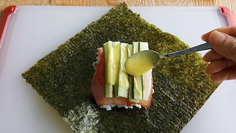 - Layer the filling ingredients: place moist ingredients such as tomato and cucumber in the middle to keep the rice and seaweed from getting too soggy. Spread more sauce on top and cover with the other half of the rice.