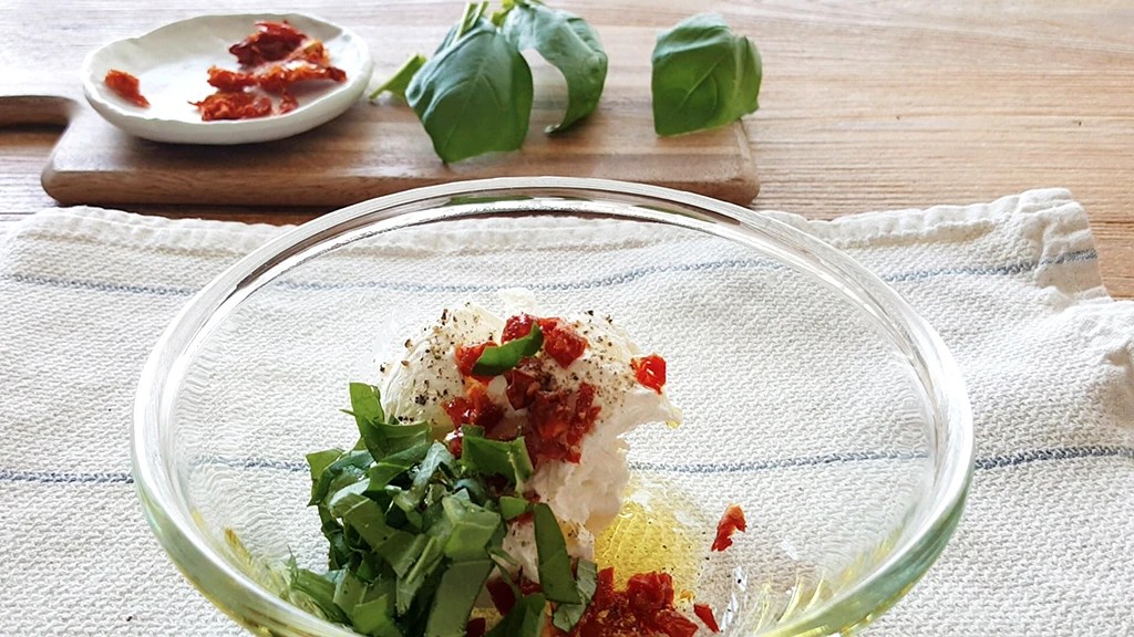 Finely chop the fresh basil leaves and sun-dried tomatoes. Add to a bowl with the rest of the ingredients and mix until a uniform, smooth consistency is achieved.