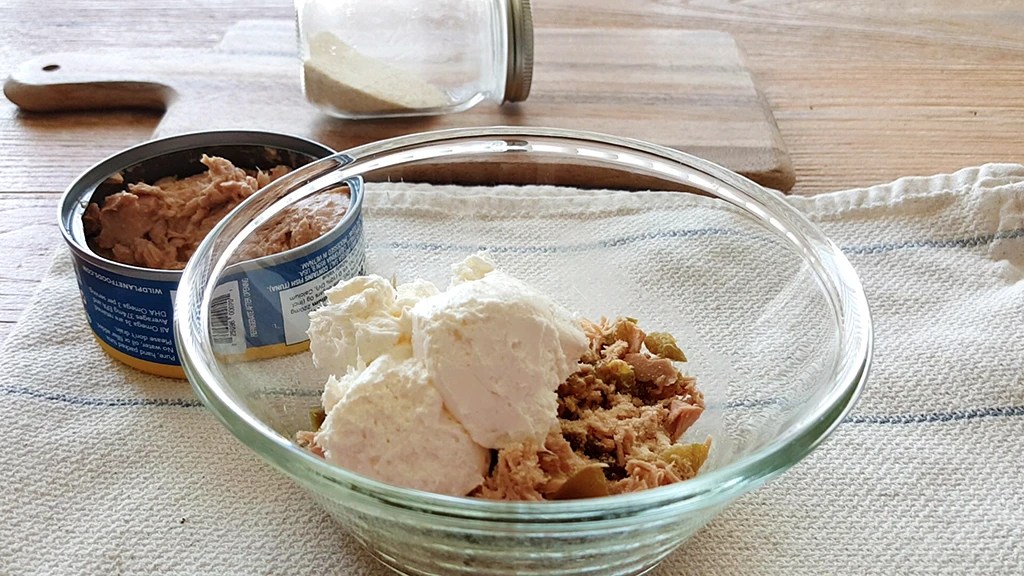 In a bowl, finely chop the pickled jalapenos with shears. Drain the tuna and add to the bowl with the rest of the ingredients. Flake the tuna and mix until a uniform, smooth consistency is reached.