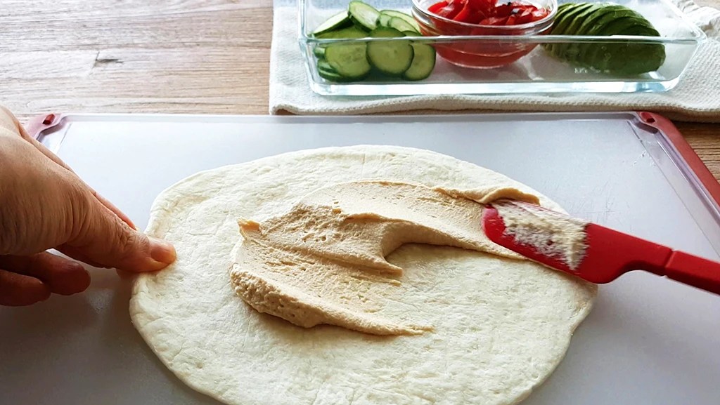 Lay a tortilla on a work surface, then spread a thick layer of hummus in the middle but not close to the edges.