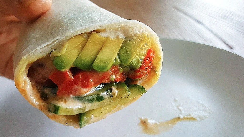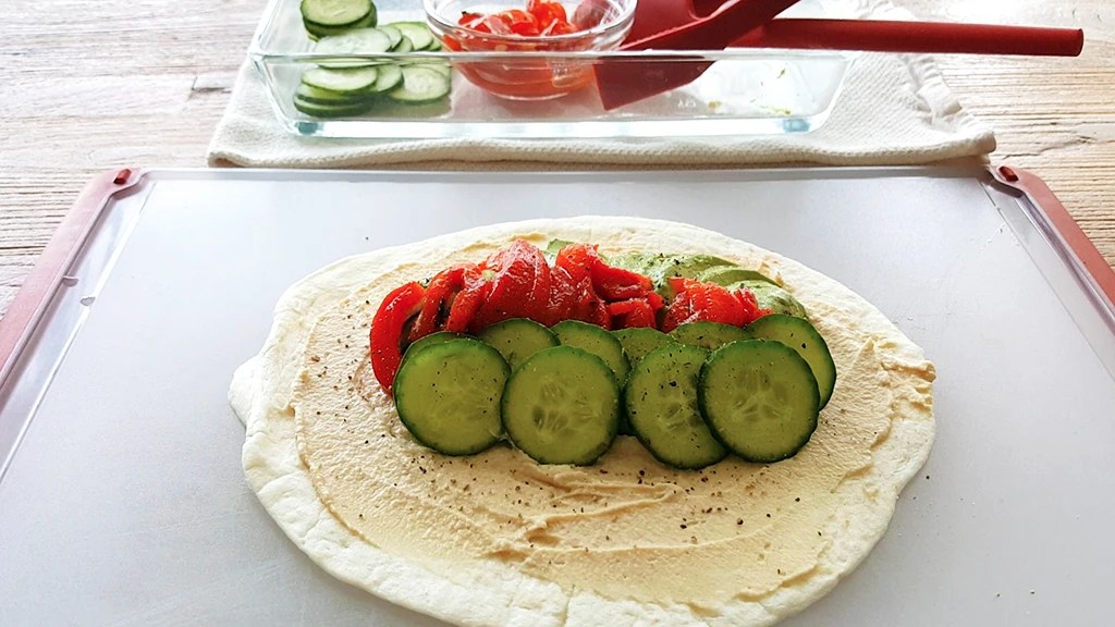Arrange the avocado, roasted red pepper, and cucumber over the hummus. Sprinkle with salt and pepper and finish with a drizzle of olive oil. Roll up burrito-style and cut in half to serve.