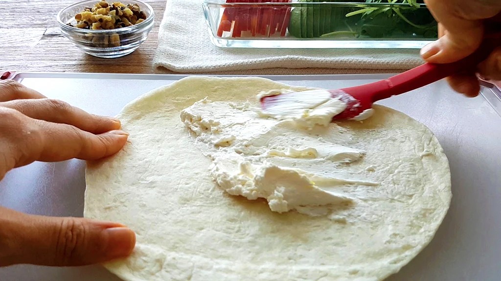 Lay a tortilla on a work surface. Spread a thick layer of cream cheese across the tortilla, leaving about an inch around the edges. Then sprinkle toasted chopped walnuts over.