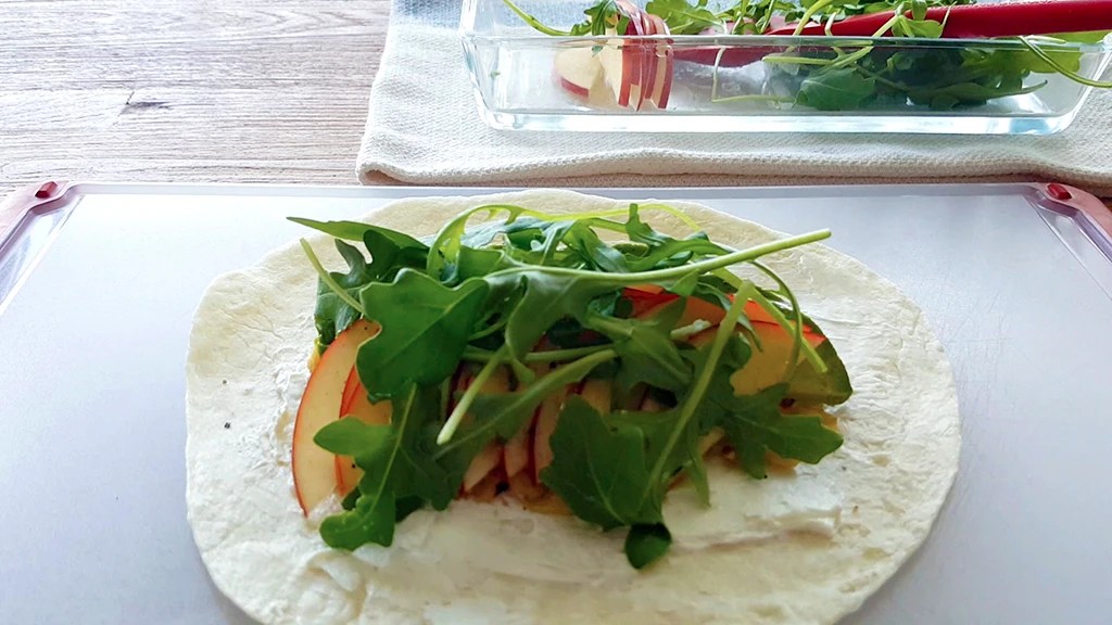 Arrange the avocado and apple slices in the middle. Season lightly with salt and pepper and drizzle with honey. Top with arugula and roll up burrito-style. Cut in half and serve.