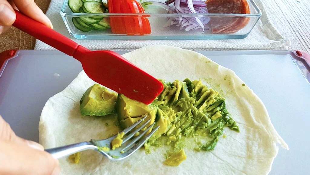 Lay a tortilla on a work surface. Halve the avocado and roughly chop the flesh inside the skin. Scoop the flesh onto the tortilla and gently mash and spread out with a fork. Season lightly with salt and pepper.