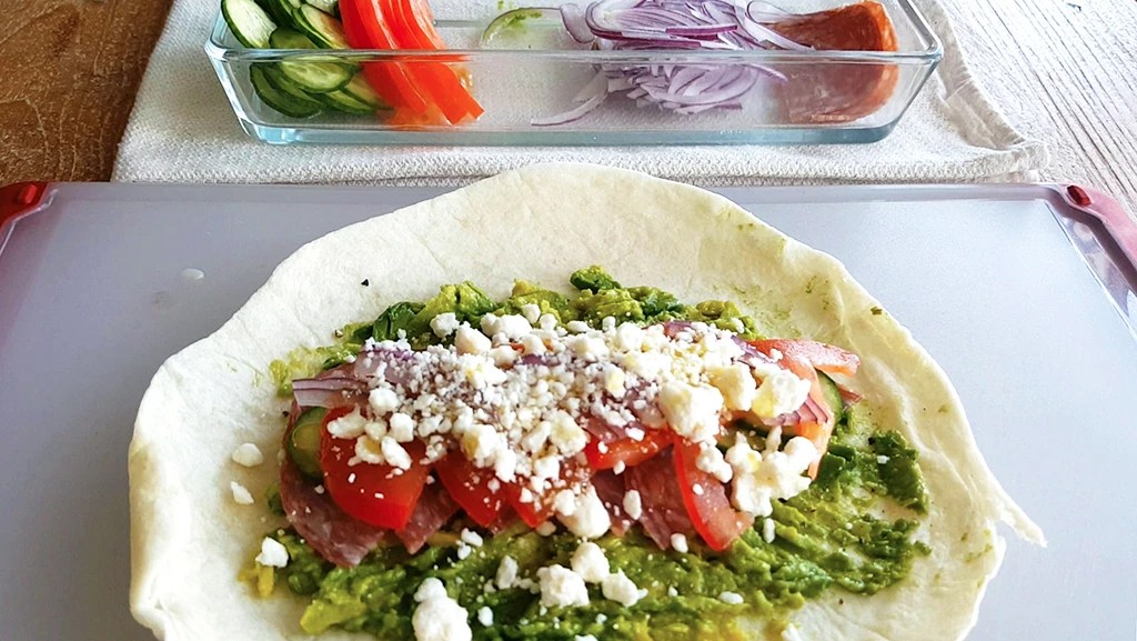 Layer the ingredients in the order of salami, cucumber, tomato, and red onion in the middle of the tortilla. Finish with a sprinkle of feta cheese and a drizzle of olive oil. Roll up burrito-style and cut in half to serve.