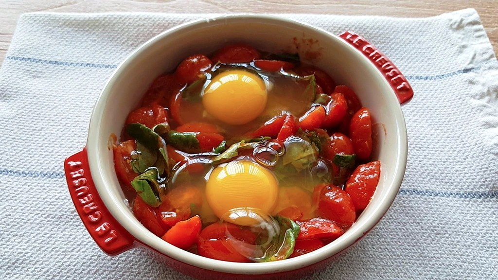 Preheat the toaster oven to 400˚F (200°C). Cut the cherry tomatoes in half and tear the basil leaves into pieces. In a shallow oven-safe dish, add all the ingredients (except the eggs) and mix them together to combine.