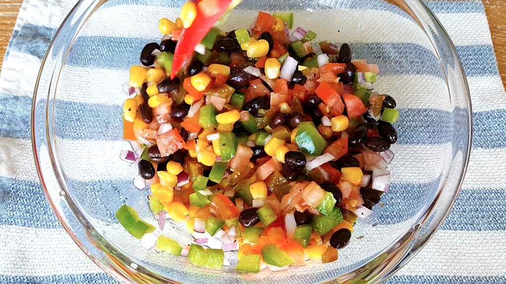 Drain the can of black beans and thaw the frozen corn. Dice the tomato, bell pepper, and red onion into small cubes. Finely chop the pickled jalapeños. Then add all the ingredients together in a bowl.