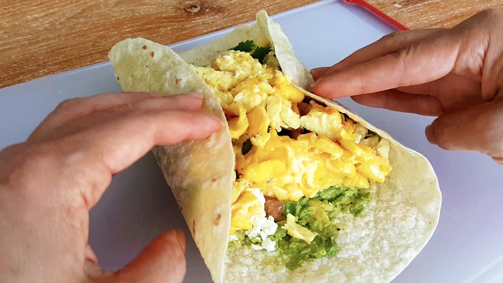 Fold the sides in and then the bottom up. Roll up tightly, tucking in the sides. Cut in half and serve with extra salsa.