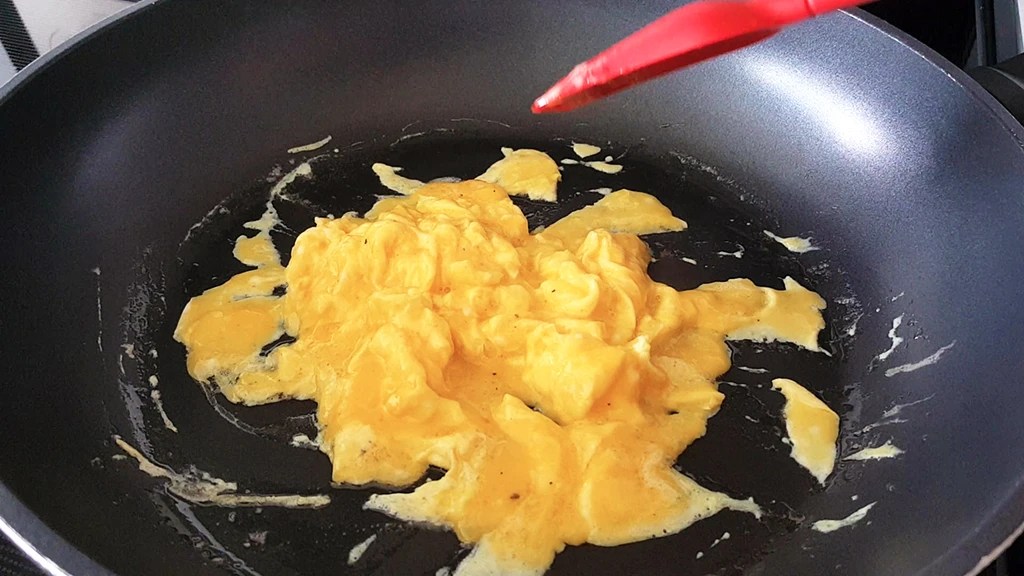 Beat the eggs together with salt and pepper until light and frothy. In a nonstick pan, melt butter over medium heat. Once the butter begins to foam, pour the egg mixture into the pan. Use a spatula to stir until soft curds form and the eggs are cooked through.