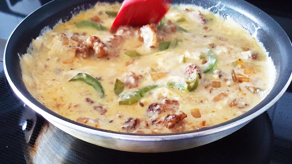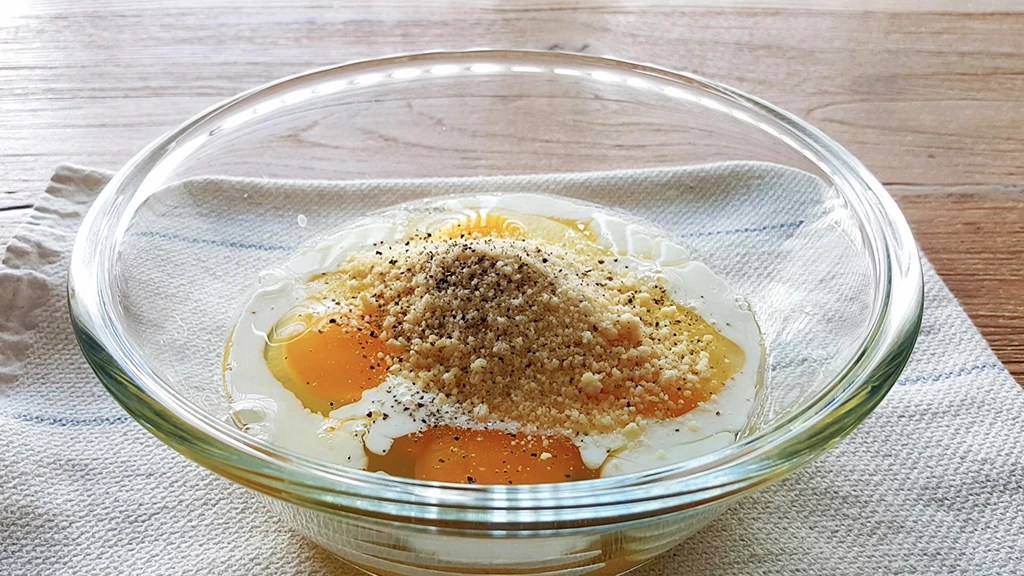 Beat the eggs with the ingredients of the egg mixture until light and frothy.