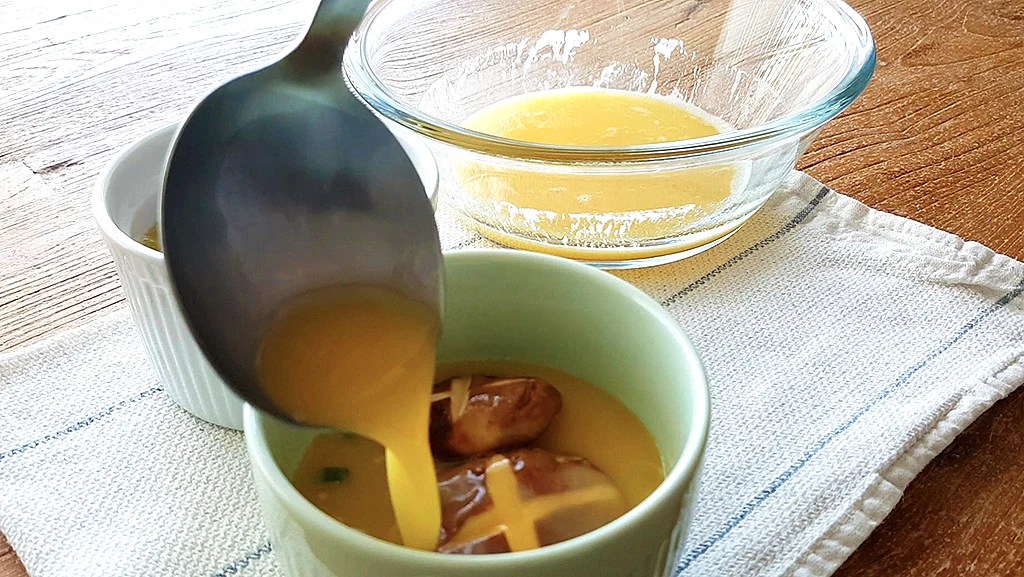 Beat the eggs together with the seasonings until light and smooth but not foamy. Add the water and stir to blend. For an extra silky texture, strain the egg mixture through a fine sieve.
