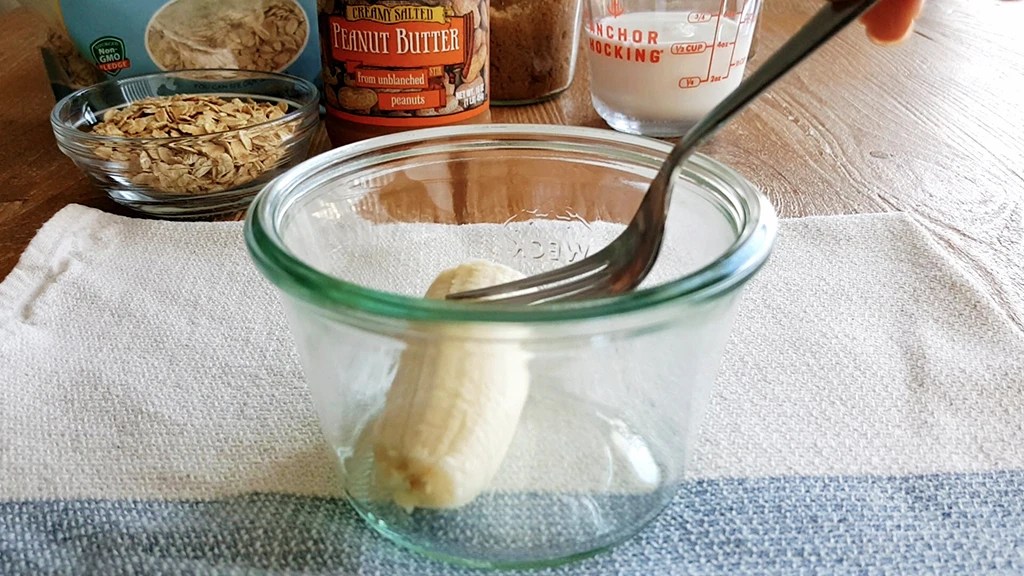In a small jar, mash the banana with a fork and stir together with the peanut butter, honey, and cinnamon powder. Add the rolled oats and milk to the mixture. Stir until combined and cover with a lid. Refrigerate overnight or for at least several hours.