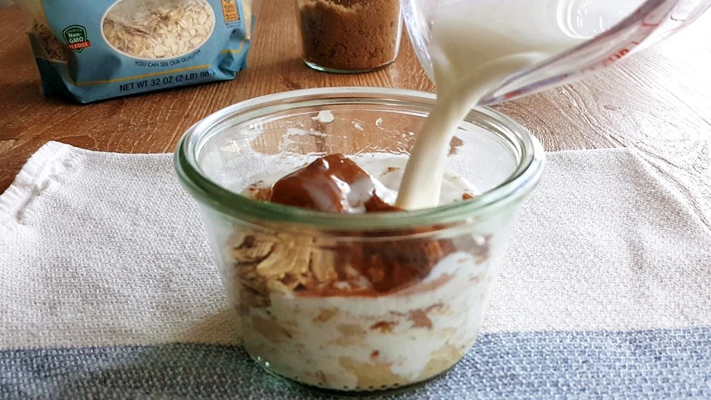 In a small jar, stir together the applesauce, caramel sauce, cinnamon powder, and salt. Add the rolled oats and milk to the mixture. Stir until combined and cover with a lid. Refrigerate overnight or for at least several hours.