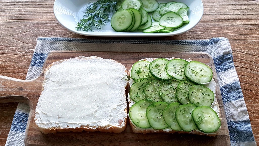 Spread a thick layer of the cream cheese mixture on both slices of bread. It will help prevent them from getting soggy. Then place the cucumber slices on one side of the bread, and sprinkle fresh dill over the cucumber. Finish with freshly ground black pepper.
