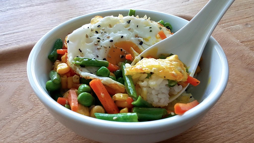 Have you ever tried the classic egg rice bowl with soy sauce and sesame oil? If so, you’ll love this upgraded version with vegetables. Frozen vegetables save time on prep work and turn this simple dish into a hearty, well-balanced meal in just a few minutes.