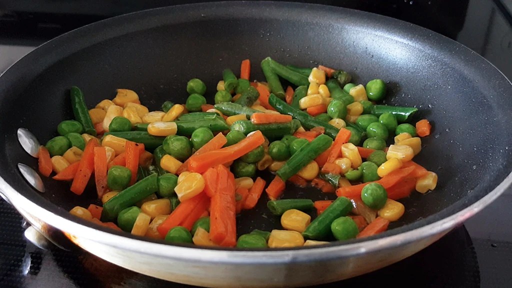Add more oil to the pan if necessary. Add the frozen vegetables directly into the pan over medium-high heat and stir to coat them in oil. Season with salt, soy sauce, and sesame oil, and stir-fry until heated. Finish with freshly ground pepper. Ensure not to overcook them–most frozen vegetables are blanched and cook much faster than fresh ones.