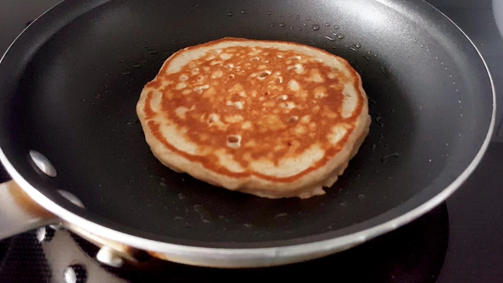 Cook until bubbles rise to the surface and the edges look dry, for about 2 minutes. The batter should rise slightly and begin to bubble. Flip the pancake over and cook until golden brown on the bottom for a minute.