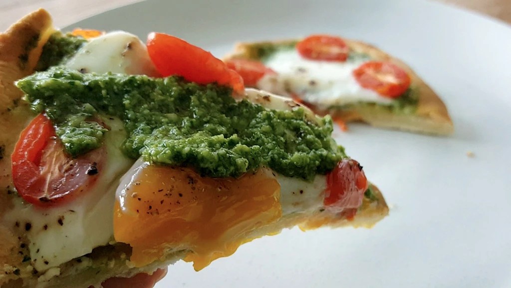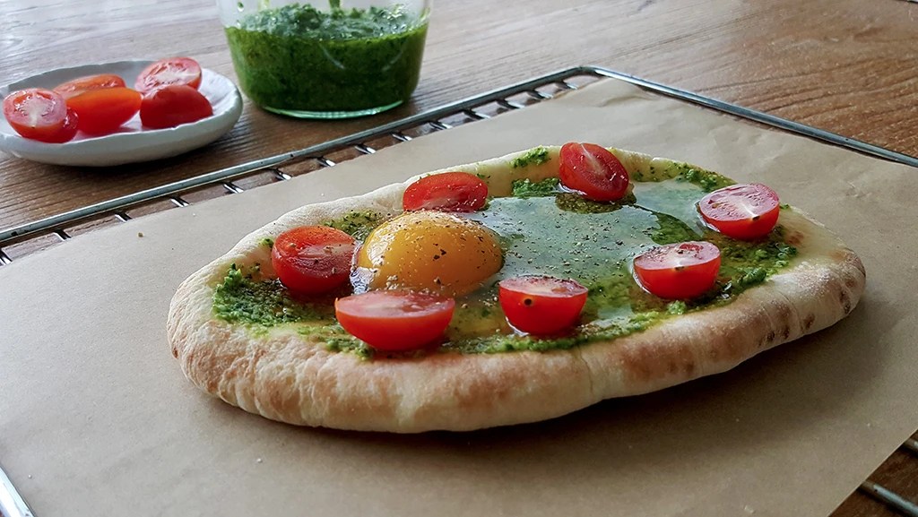 Spread the pesto over the flatbread, leaving a border around the edge. Halve the cherry tomatoes and arrange them around the edges to prevent the egg from slipping off. Crack an egg in the middle, and pierce the yolk with a toothpick or fork. Season with salt and pepper on top.