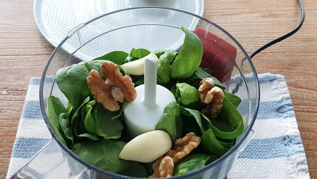 Place all the ingredients in the food processor, starting with the leaves at the bottom and ending with olive oil.