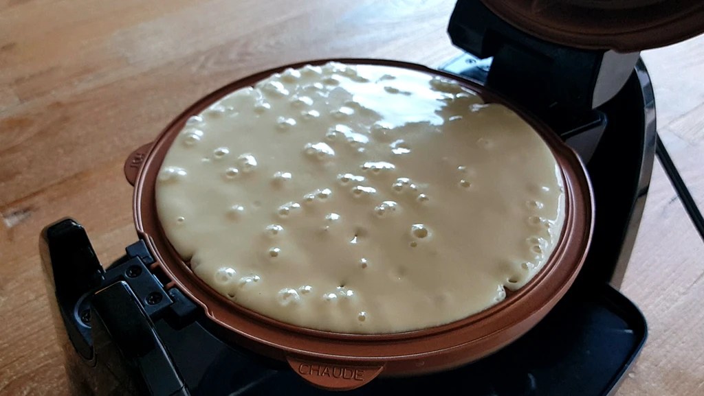 Pour the batter into the iron and cook until almost no more steam comes out about 5 minutes. You may adjust the cooking time to your desired level of crispness.