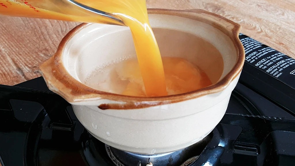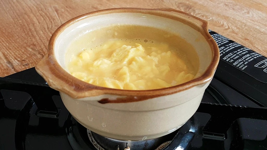 Bring the water to a boil in a small pot. When it starts boiling, reduce to low heat and immediately pour the egg mixture into the pot. Stir quickly to blend the egg mixture and water before the curds form.