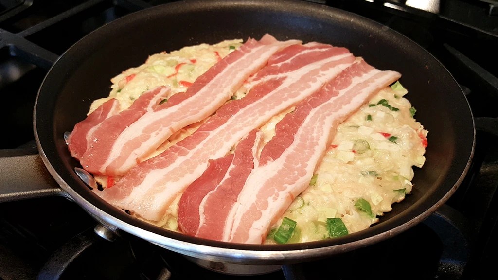 Step 1: Heat the pan with 1 Tbsp vegetable oil over medium-high heat. When the oil begins shimmering, pour the mixture into the pan and spread out evenly. Lay uncooked bacon strips across the top and cook undisturbed until golden brown on the edges and bottom. Adjust the heat as necessary.