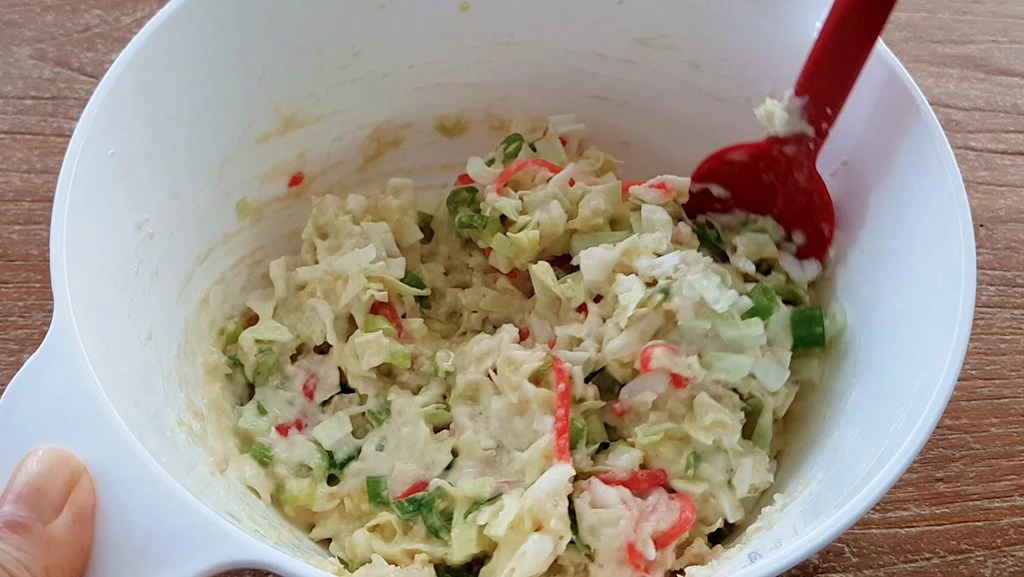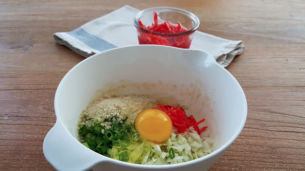 Add the flour, baking powder, and salt in a bowl and mix to evenly distribute. Next, add the soy sauce and water, and mix until blended and there are no lumps. Then, add all the mix-ins to the batter and combine.