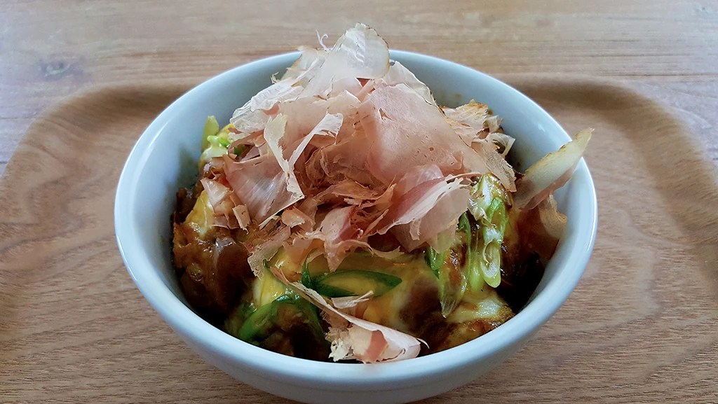 Place steamed rice in a bowl and slide the cooked eggs from the pan onto the rice. Top with a handful of bonito flakes (optional but highly recommended).