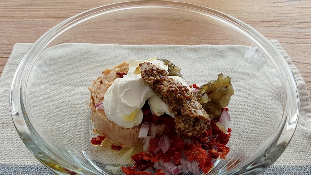 Transfer the tuna, onion, and sun-dried tomato to a bowl. Add the remaining tuna salad ingredients and mix together, breaking up the tuna until evenly combined.