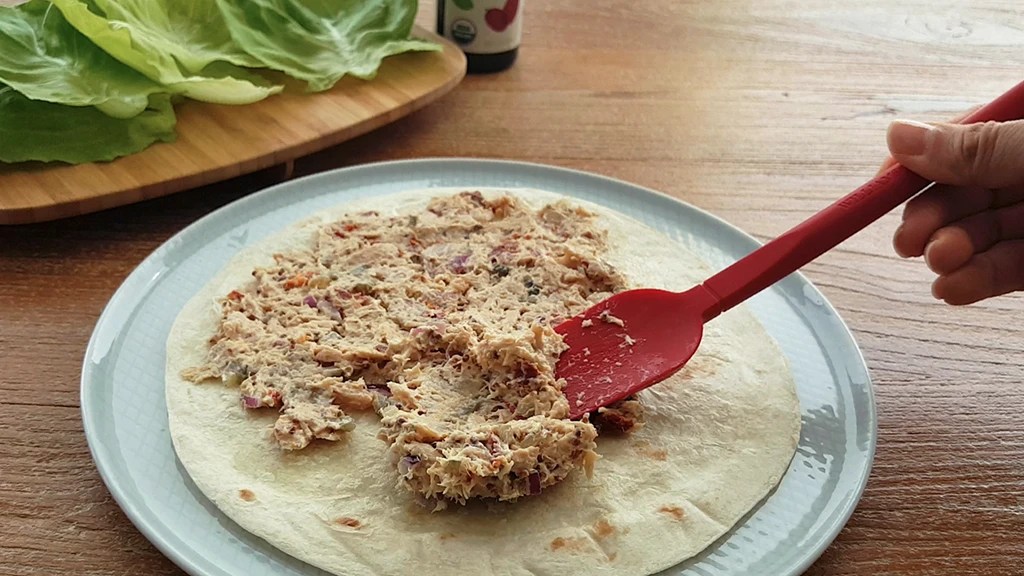 Lay a flour tortilla on a flat surface. Spread the tuna salad evenly over the tortilla leaving the edge clear. Place butter lettuce in the middle and drizzle with balsamic glaze (optional). Roll it up from the bottom as tight as possible, gently pressing down on the ingredients. Cut diagonally across the middle and serve.