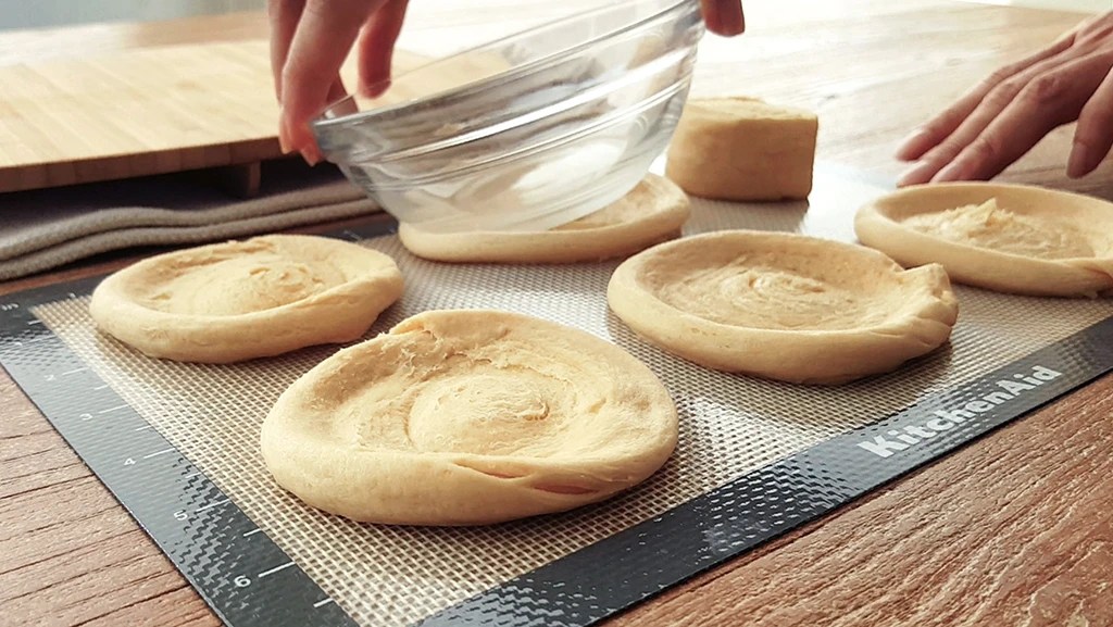 Step 2: Press each piece into a flat round using a small round-bottom bowl. Swirl the bowl around to flatten the dough and make the center thinner than the edges.