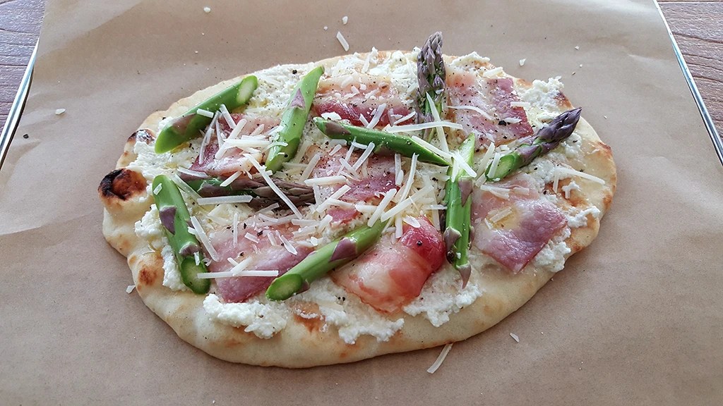 Line the rack with parchment paper and place a flatbread. Brush lightly with olive oil and spread a thick layer of the ricotta mixture, leaving the edges clean. Add the bacon and asparagus pieces evenly across the top. Lightly season with salt and pepper and sprinkle parmesan cheese.