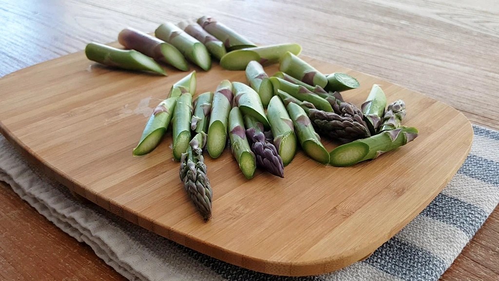 Slice the asparagus spears diagonally into bite-size pieces.