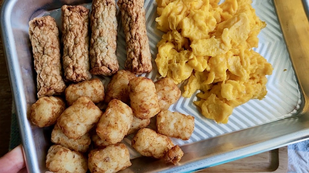 Preheat your air fryer to 390°F (200°C). Scatter the frozen breakfast sausages and tater tots in a single layer within the basket and air fry for 8 minutes, or until heated through, golden brown, and crispy. Remove and chop into bite-sized pieces.