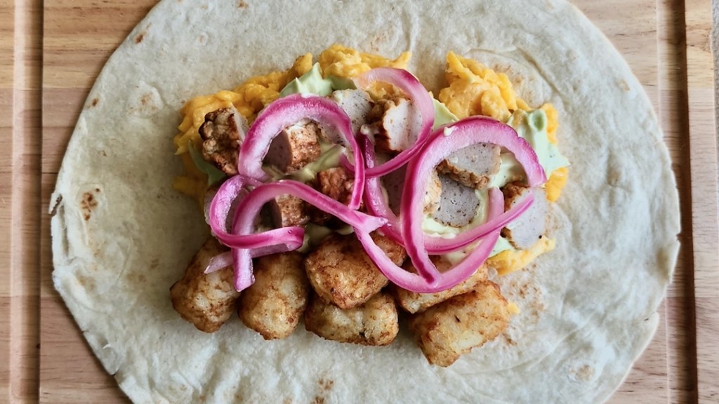 Spread half of the scrambled eggs slightly above the center of the tortilla. Below the eggs, arrange the tater tots in a single layer. Generously layer the avocado crema on top, followed by the sausages and quick-pickled red onion. Fold the sides of the tortilla inwards towards the center, then fold the bottom over the fillings and roll it up tightly, tucking in the ends as you go to secure the filling.